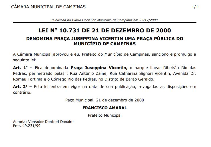 Barão Geraldo quer que o parque linear “Ribeirão das Pedras” tenha o nome da pioneira “Josephina Vicentin Fernandes”