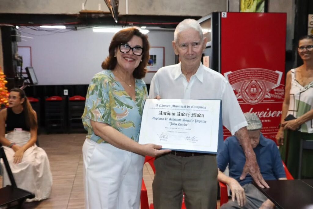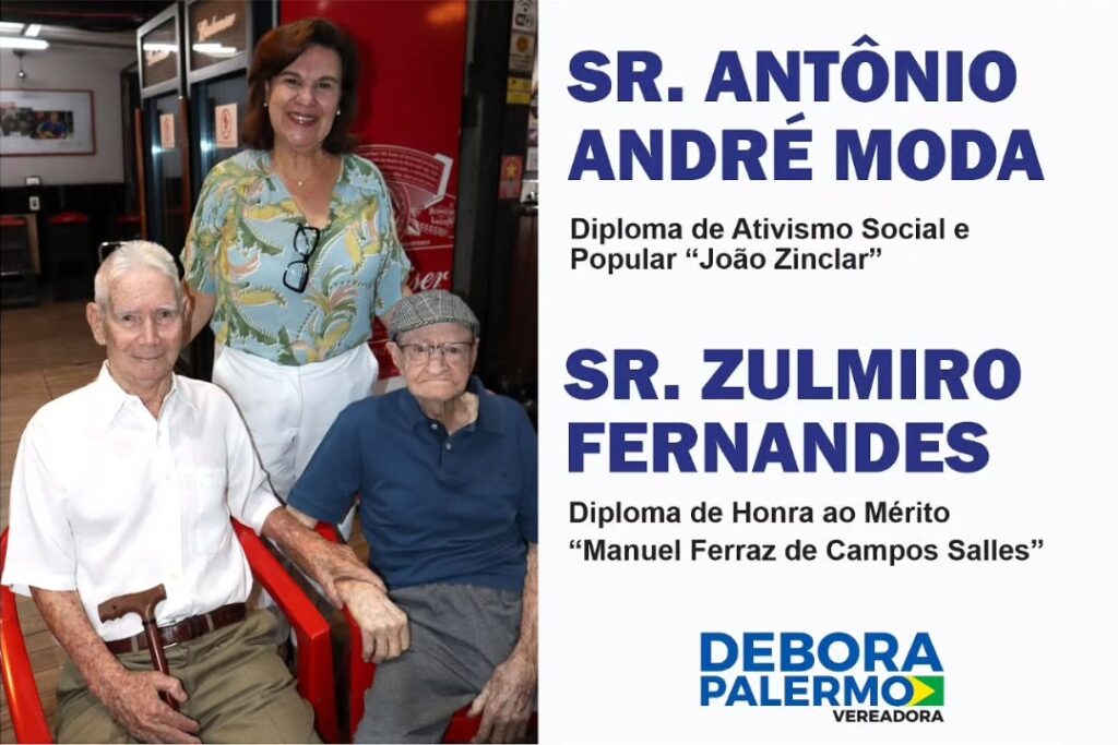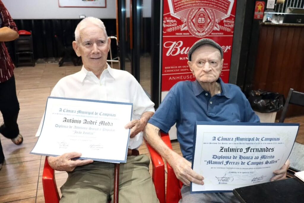 Antônio André Moda, de 92 anos (fará 93 em 4 de janeiro de 2026), ex desenhista projetista da Rhodia, recebeu o “Diploma de Ativismo Social e Popular “João Zinclair”; e Zulmiro Fernandes, que faz 99 neste natal) , foi agraciado com o “Diploma de Honra ao Mérito “Manuel Ferraz de Campos Salles”.