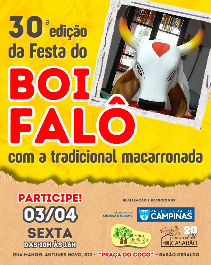 A 30ª Festa do Boi Falô será na sexta-feira Santa, 3 de abril, às 10h, na praça Irmã Carmela Stucchi , mais conhecida pelo nome da lanchonete “Praça do Coco” que dá nome à praça, na rua Manoel Antunes Novo. e terá praticamente a mesma programação dos anos anteriores com o grupo de teatro de Ton Crivelaro com sua versão autoral de uma das versões da lenda e uma programação cultural diversificada, com apresentações musicais, oficinas e a famosa macarronada de queijo com pratos servidos de graça à população, a partir das 11h30. O evento é organizado pela Subprefeitura com o apoio de moradores do distrito e conta com apoio da Secretaria Municipal de Cultura e Turismo.