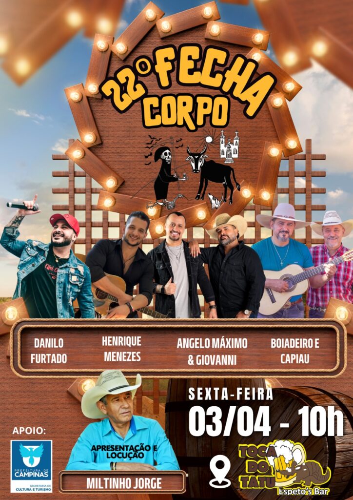 A 22ª edição da festa do Fecha Corpo será realizada nesta sexta-feira, 3 de abril, a partir das 10h, na Rua Ângelo Vicentin, em frente ao bar e restaurante Toca do Tatu. No mesmo dia será realizada a 30ª Festa do Boi Falô na chamada “Praça do Côco”