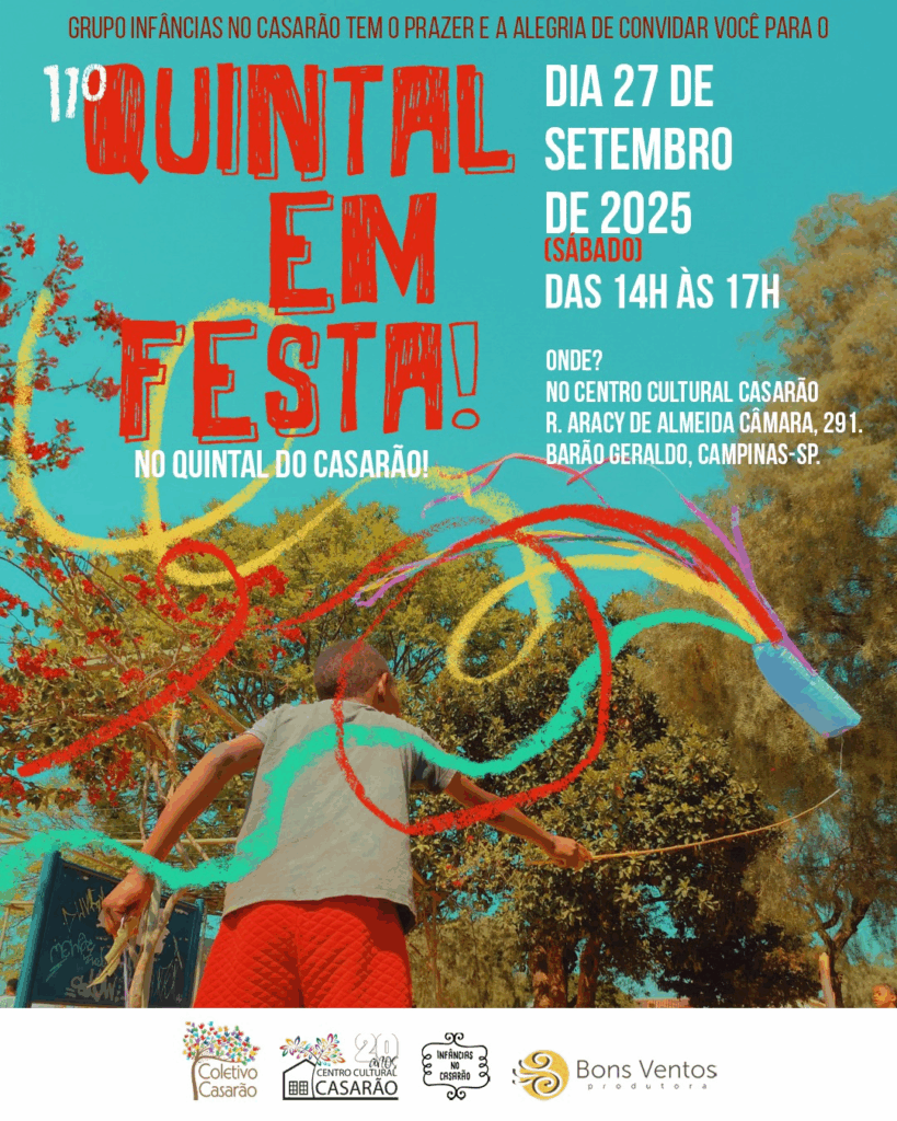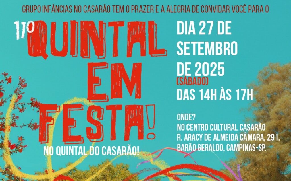 O Centro Cultural Casarão recebe neste sábado 27 de setembro, das 14h às 17h, a 11ª edição do “QUINTAL EM FESTA”, atividade do projeto “Infâncias no Casarão: encontros para brincar e festejar”. O evento tem como objetivo dar continuidade aos festejos populares realizados desde 2008 e garantir que as brincadeiras continuem existindo, porque elas são parte importante da cultura, oferecendo um espaço de encontro entre crianças, famílias, artistas e brincantes.