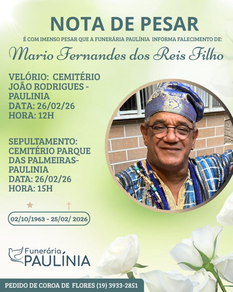 O velório será realizado hoje 26/02/26 a partir das 12h no cemitério João Rodrigues, em Paulínia. O sepultamento ocorrerá no cemitério Parque das Palmeiras, às 15h, na mesma cidade (bairro Pq.Brasil500). Axé à família e aos amigos que ficam. Que Olorum o receba de braços abertos.