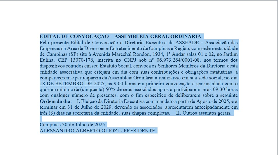 Pelo presente Edital de Convocação a Diretoria Executiva da ASSEADE (Associação das Empresas na Área de Diversões e Entretenimento de Campinas e Região), com sede nesta cidade de Campinas (SP) sito à Avenida Marechal Rondon, 1934, 1º Andar salas 01 e 02, no Jardim Eulina, CEP 13070-176, inscrita no CNPJ sob nº 06.973.264/0001-08, nos termos dos dispositivos contidos em seu Estatuto Social, convoca os Senhores Membros da Diretoria desta entidade associativa que estejam em dia com suas contribuições e obrigações estatuárias a comparecerem e participarem da Assembleia Ordinária a realizar-se em sua sede social, no dia 18 DE SETEMBRO DE 2025, às 9:00 horas em primeira convocação a ser instalada com o quórum mínimo de (cinquenta) 50% de seus associados aptos a participarem e às 09:30 horas com qualquer número de presentes, com o fim específico de deliberarem sobre a seguinte Ordem do dia: